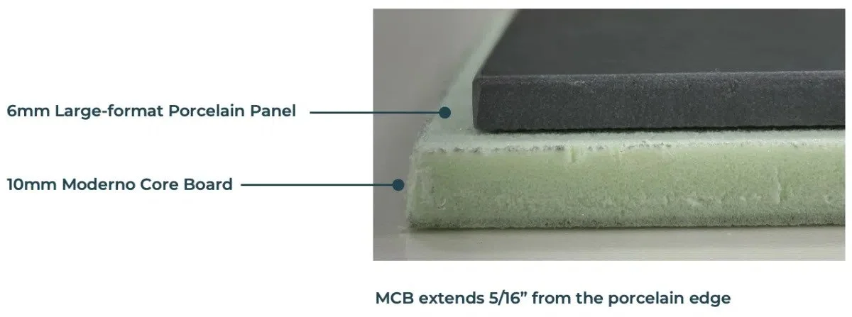 Moderno identified the pain points associated with traditional large slab handling and engineered a brilliant solution: MightySlab™. This patent innovation seamlessly integrates a 6mm porcelain slab with a robust 10mm Moderno Core Board (MCB) backing.