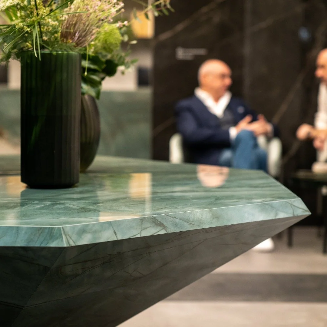 This captivating countertop design features a mesmerizing emerald green finish and a bold, geometric edge profile. The angular cuts and polished surfaces create a sense of luxury.